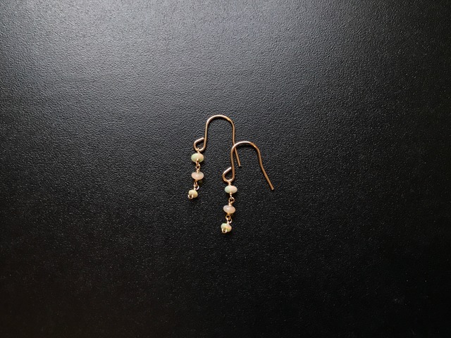 エチオピアンオパールのトリロジーピアス。 美しい三石を連ねて、シンプルながらも存在感のあるデザインに。 一点ものです。 【 マテリアル 】 ・エチオピアンオパール ・14KGF (14金ゴールドフィルド) - 14KGF (14金ゴールドフィルド)とは - 《14金》 を真鍮に熱圧着したもの。メッキとはまったく製法が異なり、金の層の厚みはメッキの100倍。 長期間使用しても剥げてくることは殆どない。 【 サイズ 】 ・全長 2.5 cm ・オパール 円径 3.5〜2.0 × 厚 1.5〜1.0 mm 別売りのネックレスとセットでお楽しみ頂けます。 ドレッシーにもカジュアルにもどうぞ。 ご不明点はお気軽にお尋ね下さい。 □■□ ご注意 □■□ 以下、あらかじめご理解ご了承願います。 * 普通郵便 (定形外 / 補償なし)送料込です。 他の発送方法をご希望の方は、ご購入お手続き時にご希望のものを選択下さい。 * お買上合計 1万5千円以上にて宅配便送料サービスさせて頂きます。 (商品欄に【宅配便無料】とあるものは、金額問わず宅配便送料サービスとなります。) * ハンドメイドにつき、非常にデリケートな製品です。 * 天然資材、特にナチュラルな風合いがそのまま活かされているものをセレクト、使用しています。 したがって《エクボ/凹凸》《クラック/ごく小さい・浅いヒビ》《インクルージョン/内包物》が入っている場合がありますが、その中でも【例えそれらがあったとしても石自体が素晴らしいもの】【商品として相応しいもの】のみを厳選しています。 * ご覧頂いている環境によって、色の見え方など《実物》と《画面》で異なる場合があります。 また天然石やビーズには、画像に写らない程ごく小さな傷やヒビがある場合もございます。 * お肌がデリケートな方、アレルギーのある方はご注意下さい。