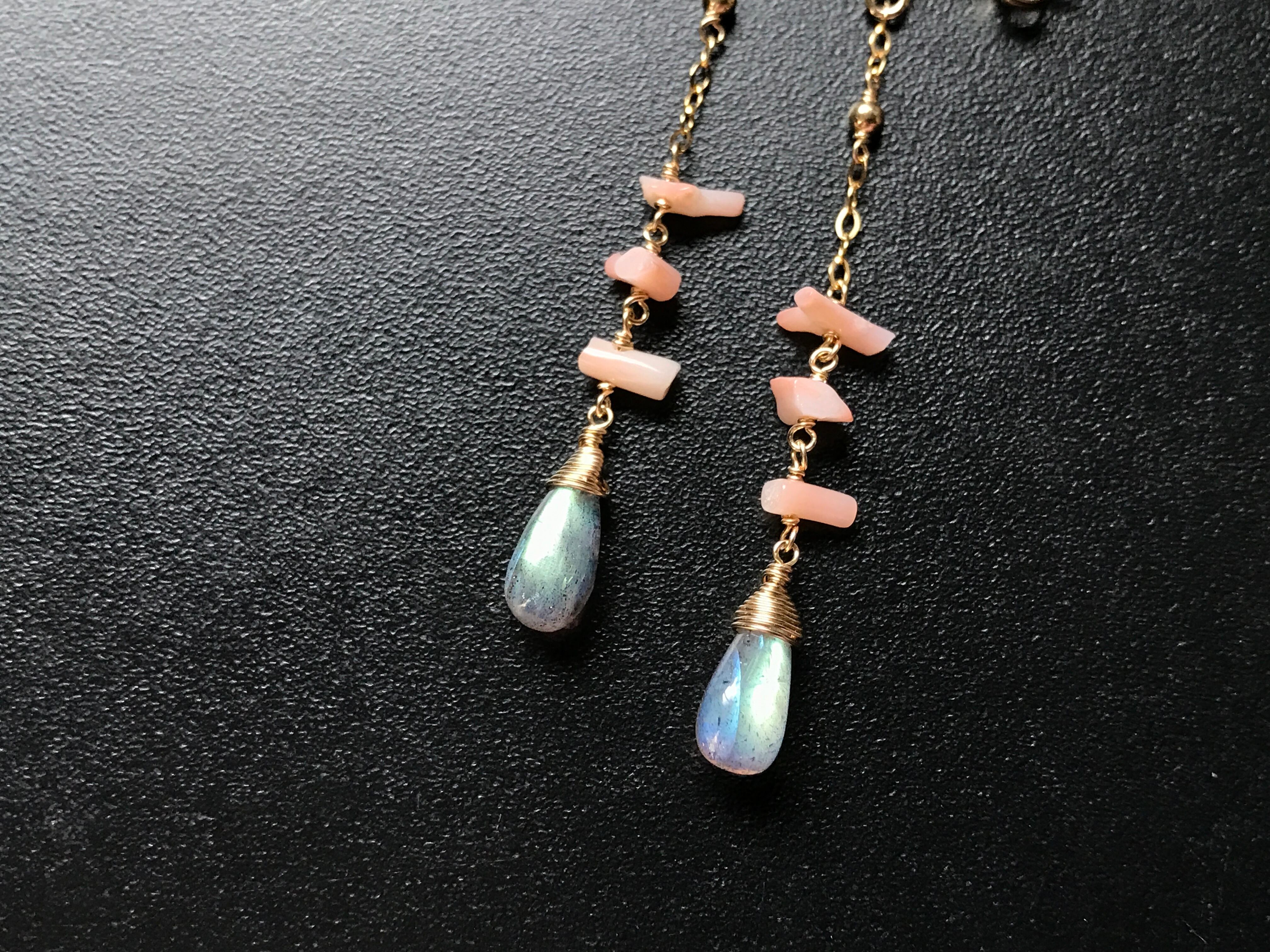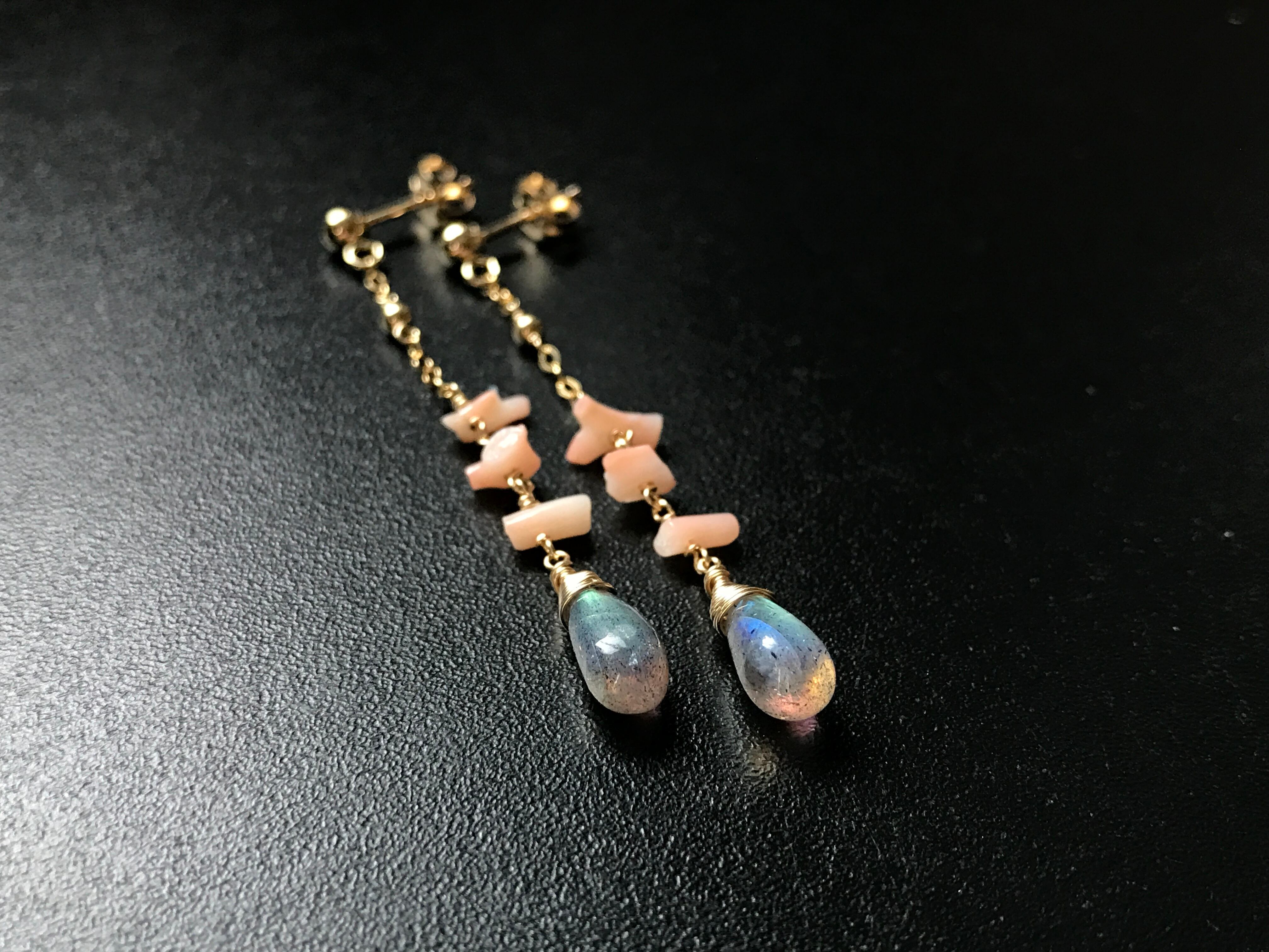 マーメイドをイメージした、ラブラドライト × 天然モモサンゴのピアスです。