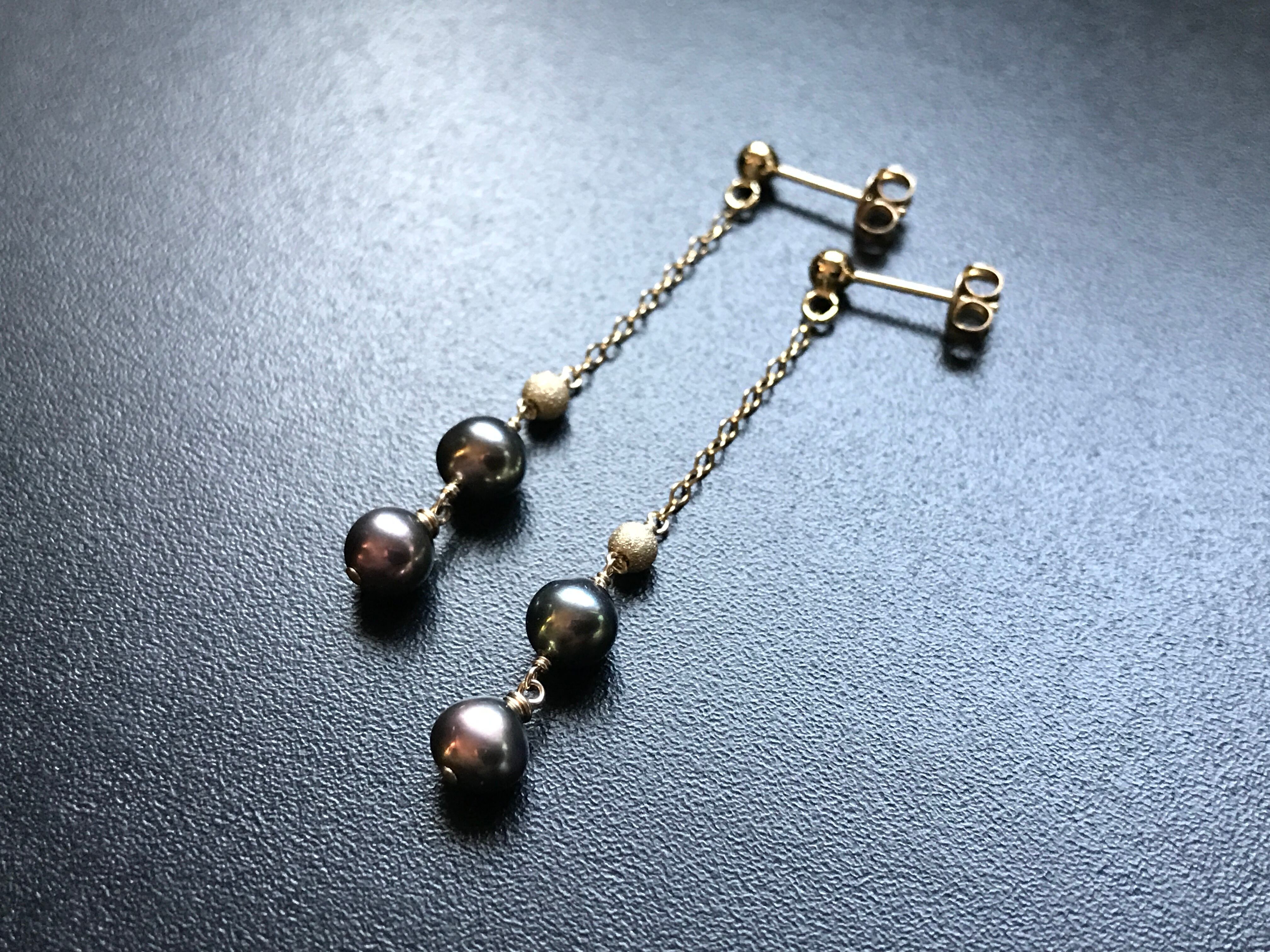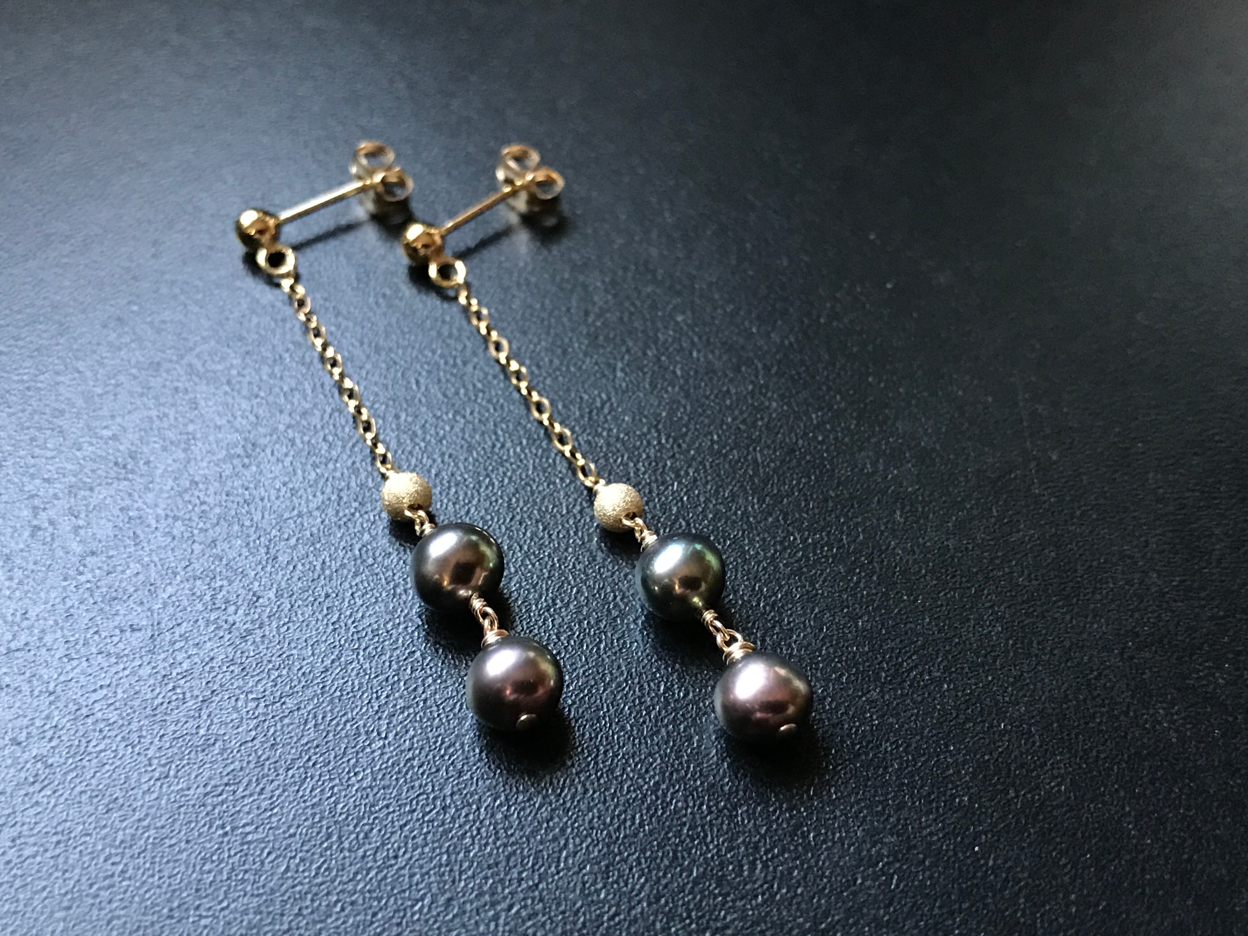 美しい淡水パールを色違いで二つ連ねたピアス。